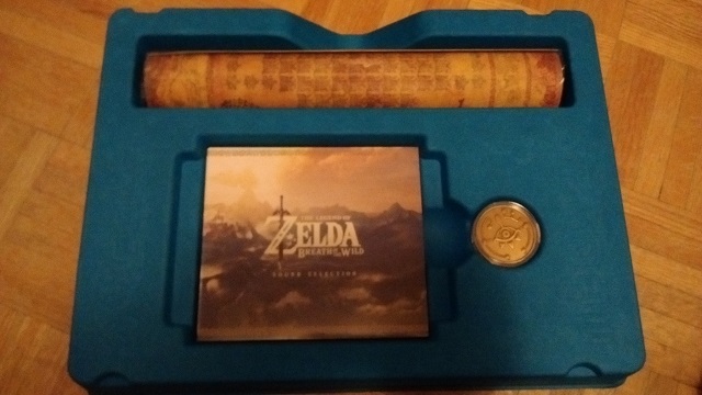 Kept in a blue tray is the soundtrack CD, Sheikah Coin, and map. They are all individually sealed with plastic wrap — loose for the map, shrink for the CD, and a case for the coin. There’s not much to look at with the coin, so we’ll focus on the other two items. It should be noted that the coin is metal, and has a fairly nice gleam to it.
