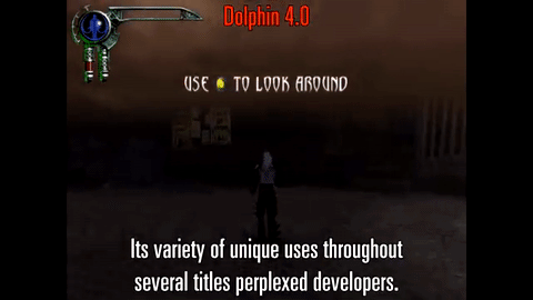 With Dolphin 4.0, notice how the cloudy moonlit sky smothers the character and nearby structures when the player looks in a certain direction.