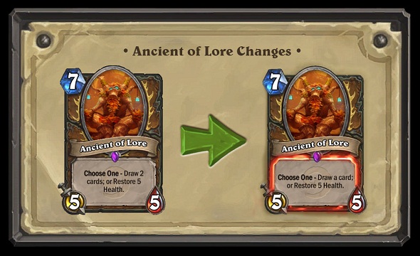 The changes reduce the card draw down to one card. This brings the card’s effect in line so that one option isn’t necessarily far more appealing then the other. Ancient of Lore has long felt like a must-have in Druid decks, and it seems the developers would like to encourage players to feel like they have other available options.
