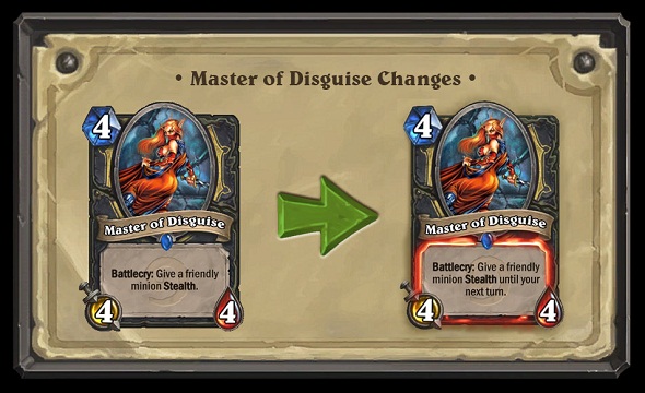 The ability of Master of Disguise to grant permanent Stealth has been a design obstacle for a long time, so we are changing Master of Disguise to only grant Stealth until the next turn. This change opens up exciting options for future cards.