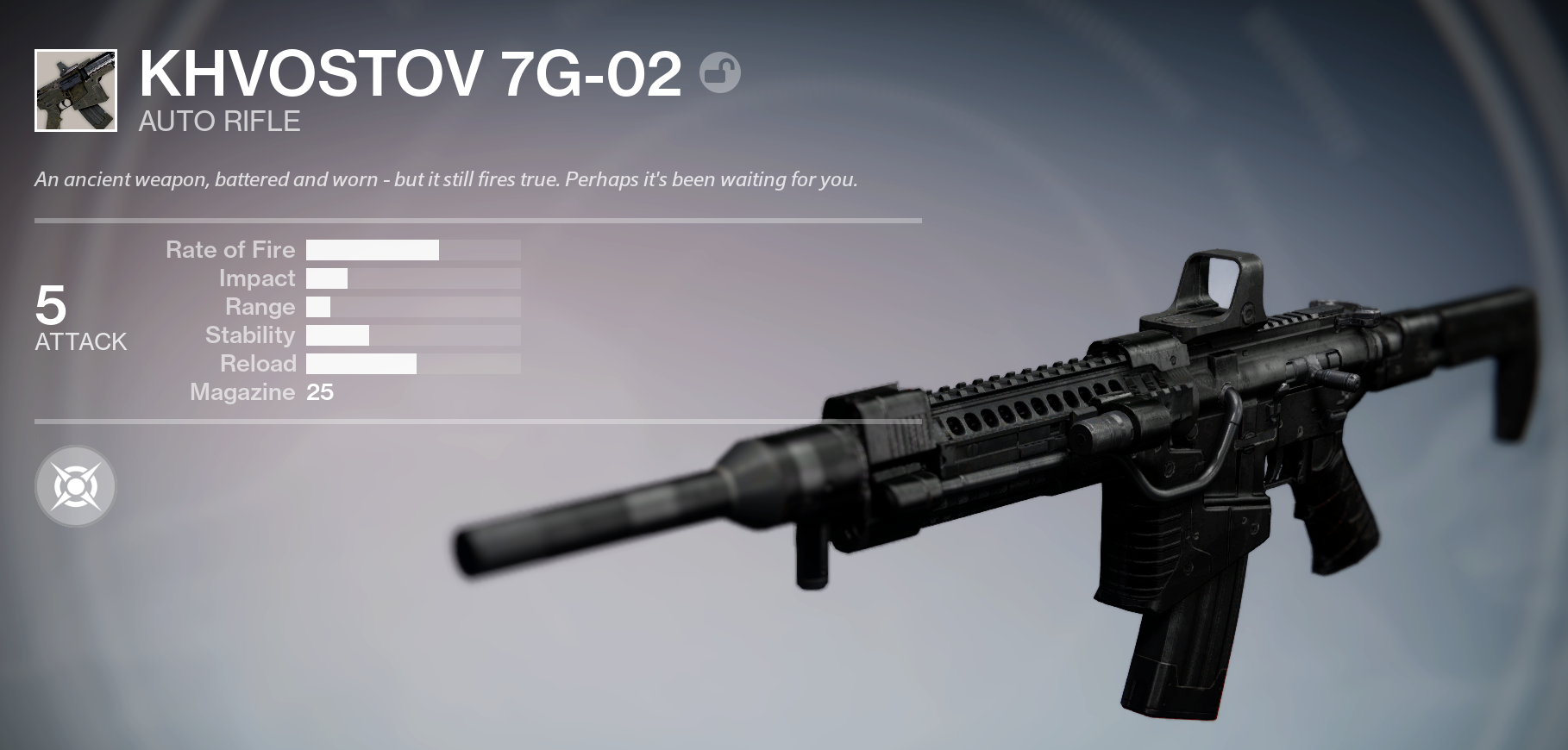 The Khvostov is the first weapon you’re given in Destiny, and it makes no attempt to hide what it is: it’s that rusty iron longsword you start with in every fantasy game, an heirloom from battles long past.