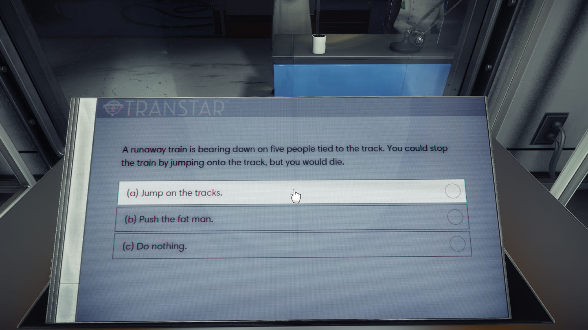 Only something’s not going right. The scientists can’t understand why you aren’t exhibiting any extraordinary powers, and one even laughs when you try to hide behind a chair to complete an objective. Suddenly it’s clear we’re not going the direction we thought we were. There’s a moment of morbid levity in the state of a mind questionnaire… and then things get weird, quickly.