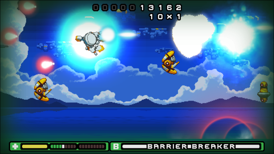 Then there’s your super move, the Barrier Breaker. On the bottom-right of the screen, there’s a gauge for the powerful weapon. As you fly close to bullets, your gauge will charge, and once full, you can deploy a powerful screen-filling attack. It will destroy all enemies and deal a good bit of damage to bosses.