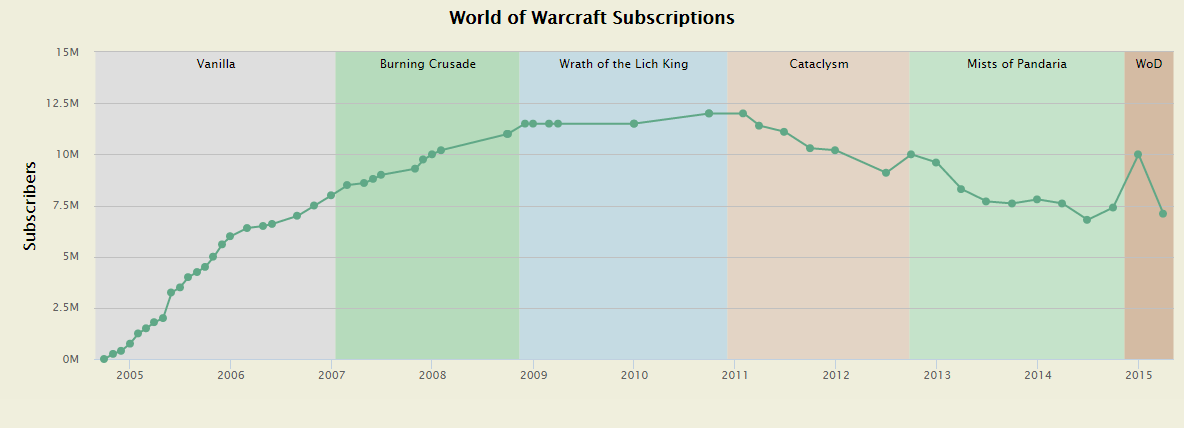 As clearly seen in the image above, subscriptions for World of Warcraft have been on a constant decline ever since Wrath of the Lich King. The short spikes that have happened since then have all been for new changes to the monetization system such as WoW Tokens or going Free to Play. I think we can safely say that if going Free to Play isn’t saving your MMO, you’re probably doing something wrong.