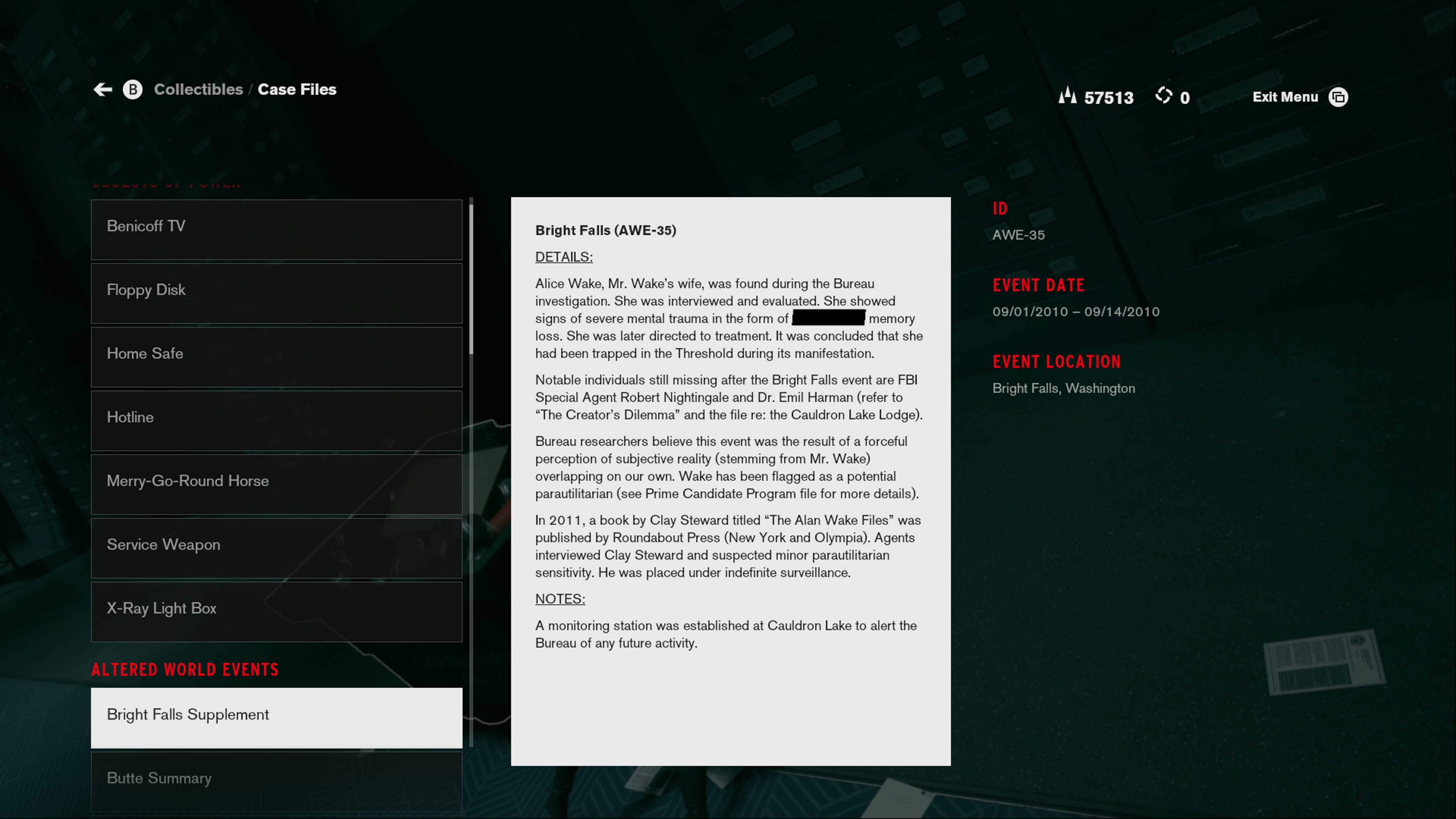 Most excitingly, Control confirms through found documents that the FBC interviewed Alan’s wife, Alice, in the aftermath of the “recurring AWE” at Bright Falls’ Cauldron Lake.