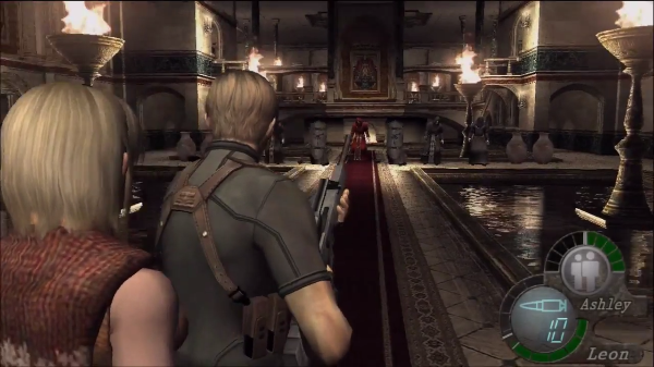 It’s a moment of realization in the castle- Leon and Ashley enter this room of the castle, with long narrow walkways separated by shallow pools of water. Music hasn’t started, but the silence is daunting and deafening. The expansive room has regions you can’t even see yet- as a wall of armed Los Illuminados are staring right back at you, with flails, shields, bloody grins and a parasite living in them all ready to explode out of their heads and eat you.