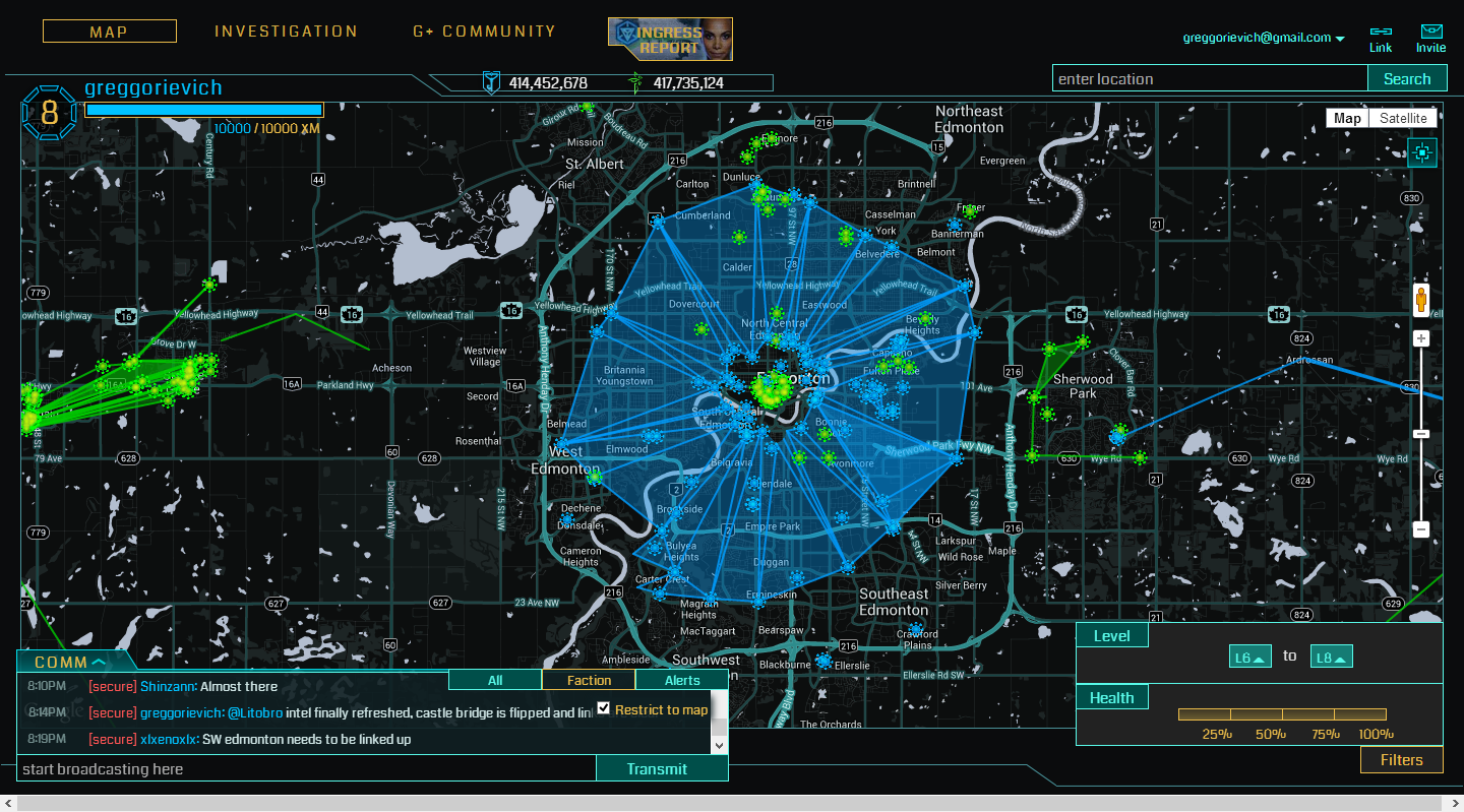 When a player is within forty real-world meters of a portal, they can hack it to receive items, and leave “resonators” claiming that portal for their in-game faction. Through teamwork with their faction, players can acquire a great number of portals and connect them to create portal links and control fields to earn Mind Units (score).