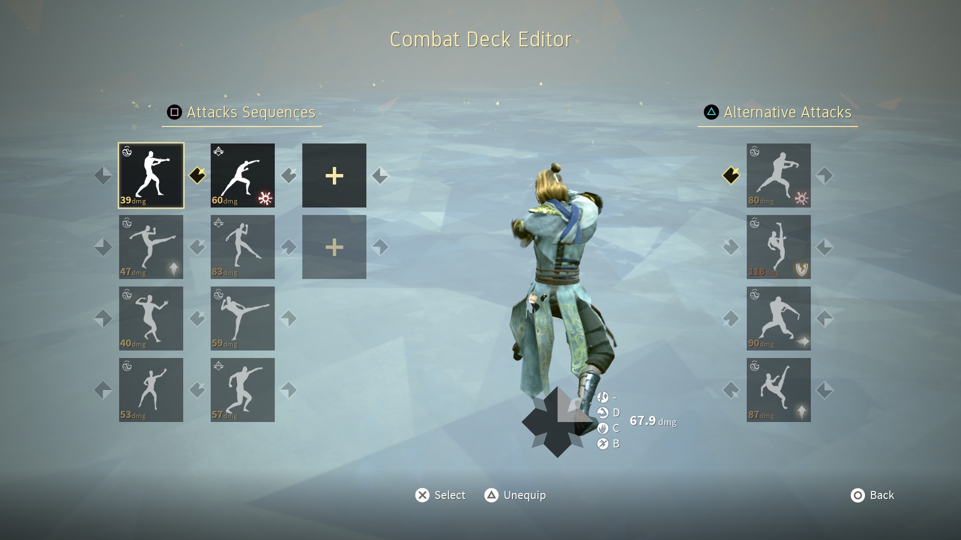 The aspect of the combat system that stands out the most in Absolver, though, is its combat deck editor. You start off with a few base moves you can do, but the further your character levels and fights opponents from different styles, the more moves you learn. Eventually, you can even switch between styles. You can string together these moves you learn in the combat deck editor (see screenshot). There are lots of moves to unlock — each with its own speed, placement (high, low, etc.), and power.