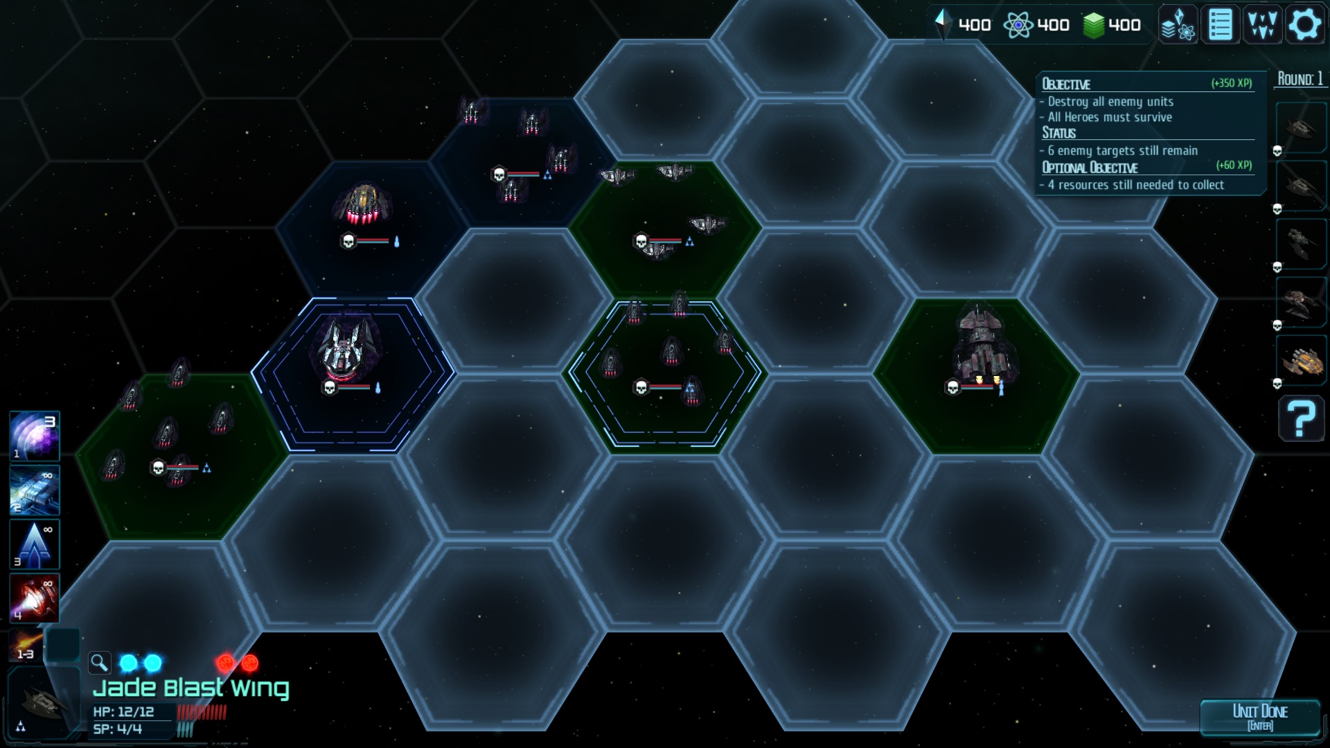 But there is also a possibility to deploy a part of your fleet on the Bounty missions through the Mission select menu, and the rest to continue the campaign. Either way, the big fleet needs to move as fast as possible, and thankfully, the tech tree will allow you to increase your Move and Ability Points.