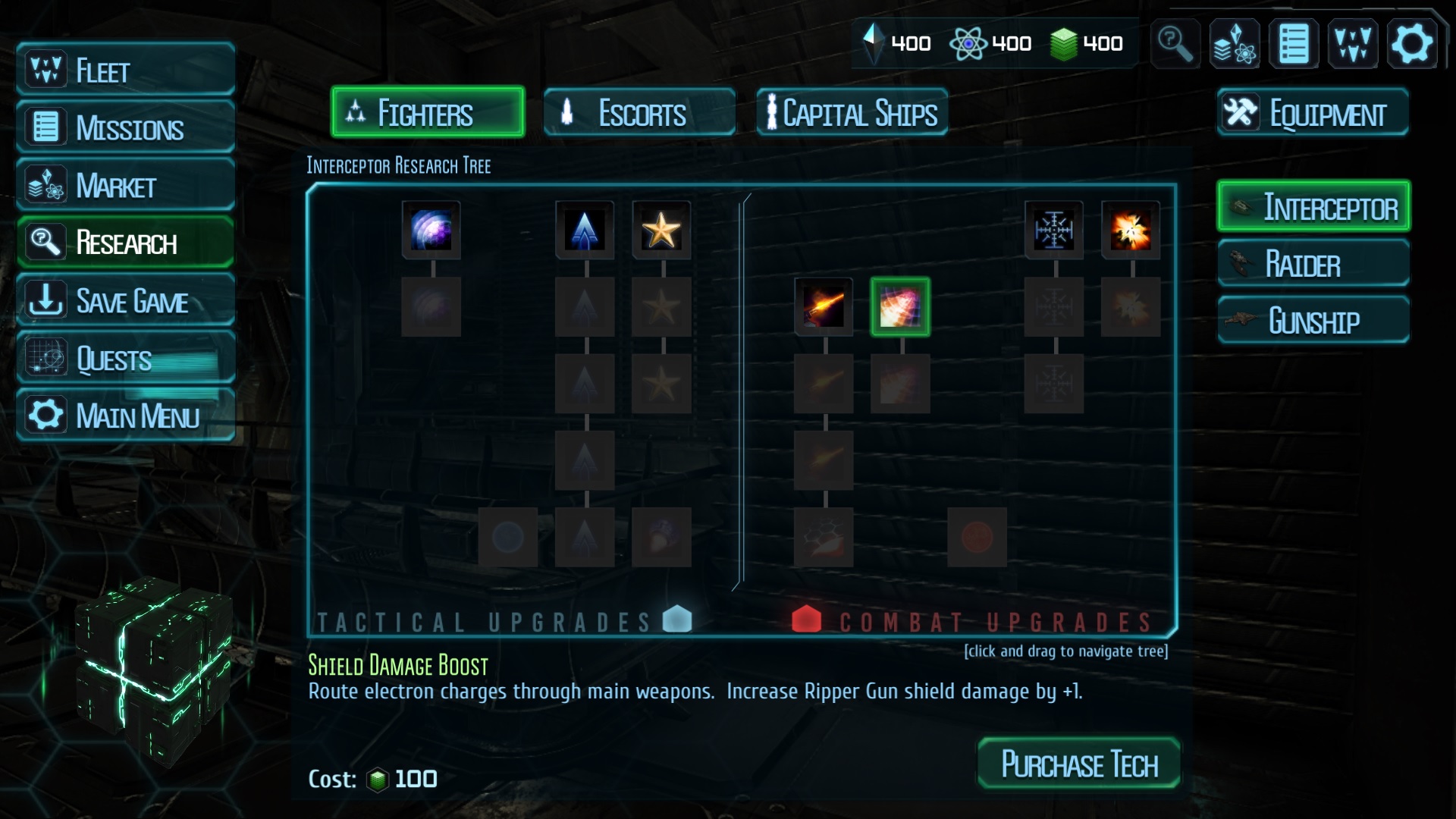 There is an extensive black market of ships and items available for purchase with the help of several types of in-game currency. Also, ships can be upgraded through a skill tree of various technologies that focus mainly on combat and tactics, which can be bought using Data, one of the main currencies.