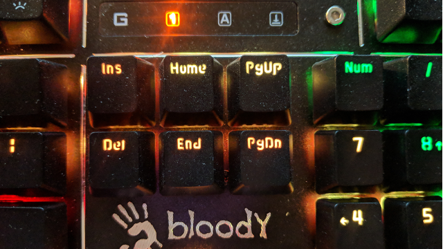 Above the arrow keys you’ll find the Bloody logo, and above the “insert”, “home”, and “page up” keys you’ll find the indicator lights for num lock, caps lock, screen lock, and the board’s Game function underneath an elegant clear plastic coating.
