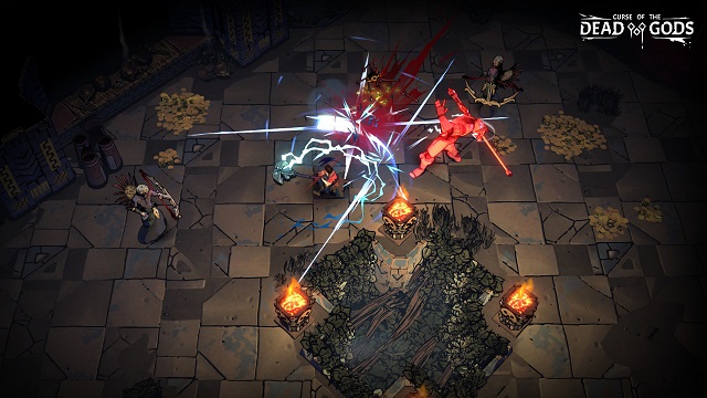 Light and dark play a big role in Curse of the Dead Gods, too. You can swap to your torch and use it to light braziers in the environment, or even set flammable parts of the environment afire, watching it spread to, perhaps, cause an explosion. Light helps you see enemies from further away, of course, but it can also cause you to take or deal more damage in darkness.