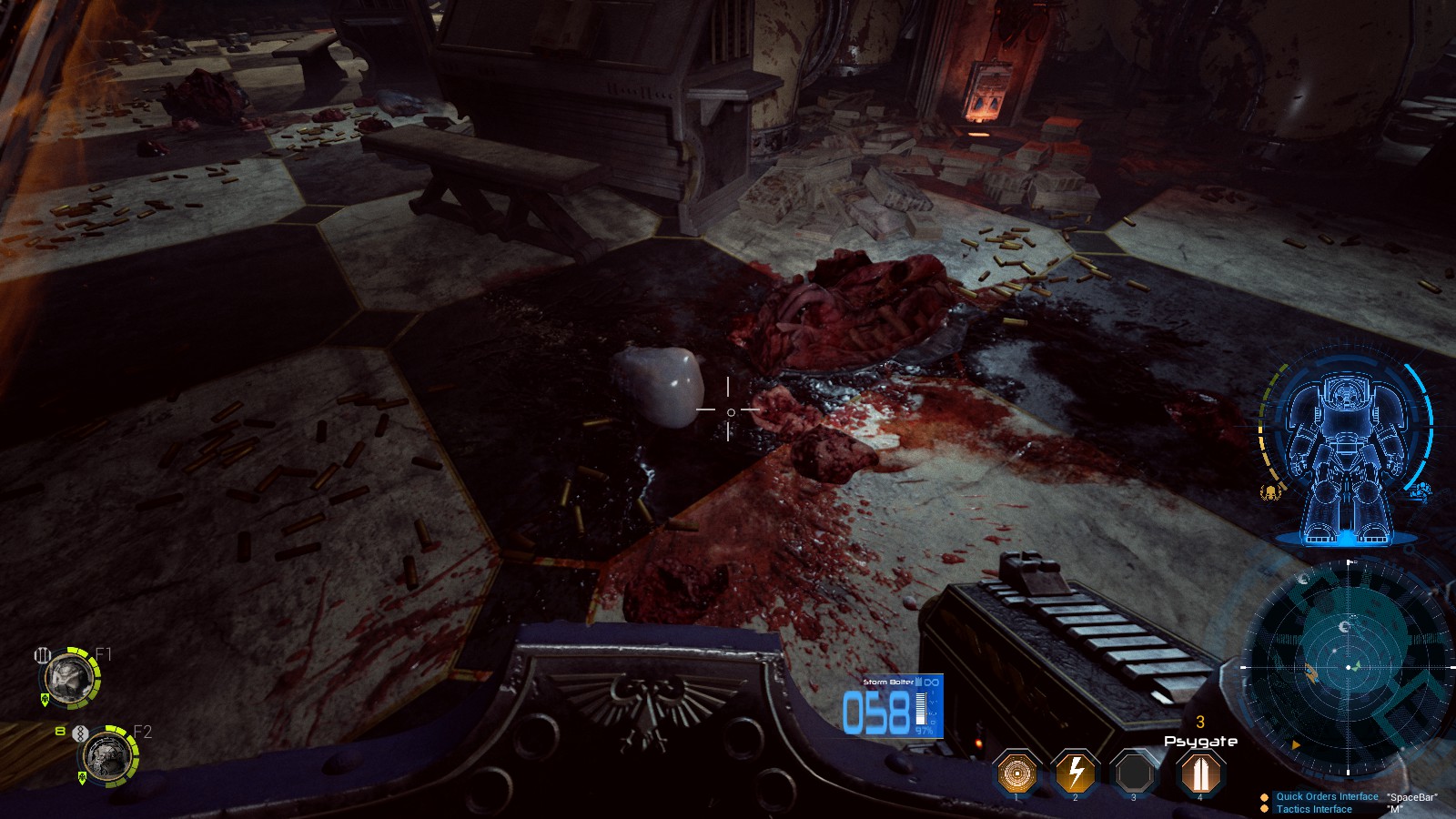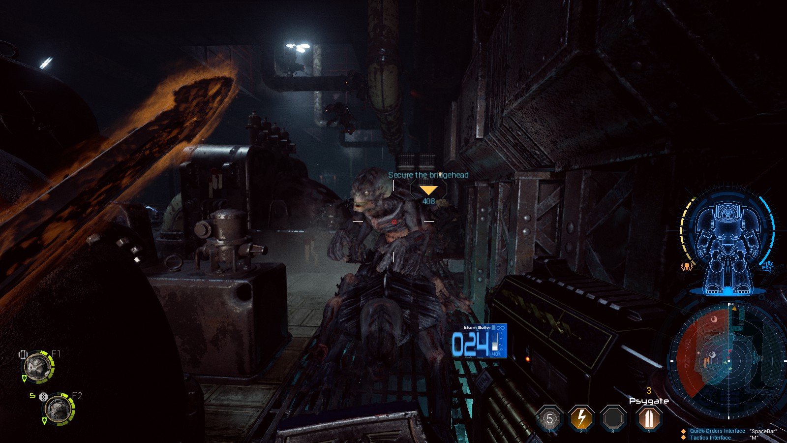 Either way, the Aliens feel is strong, with genestealers crawling along the walls out of the corner of your eye before you meet them in battle, the blipping of your mini-map, and the gore-strewn walls and hallways.