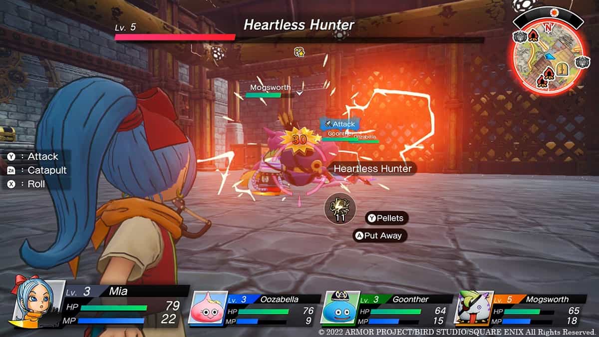 The twins play identically and can attack with their dagger or shoot a variety of different ammunition from their sling. Some are spiky balls, others elemental-based attacks. There are healing shots as well, to shoot at your teammates when they’re hurt. The only commands you can issue to your team monsters are “go forward” or “circle around you”.