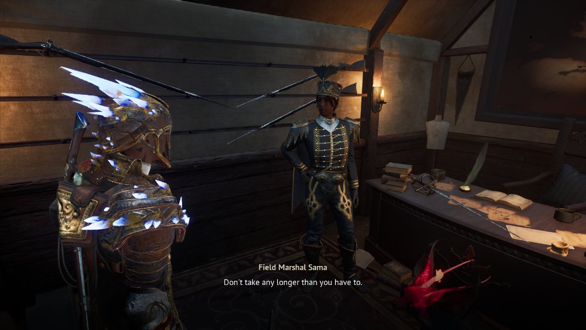 If you’ve ever played a BioWare RPG like Mass Effect or Dragon Age, this is the kind of dialogue that happens between companions when you’re traveling over long distances. It’s great for filling downtime, but it can’t drive a story. The entirety of Flintlock’s side quests, and many scenes in the main quest, use this type of dialogue. To avoid some truly awkward conversations, the dialogue is short and to the point, which in turn makes the story feel basic and undeveloped. The outline of a touching moment, a tragic speech, or a hopeful twist, but no more than the outline.