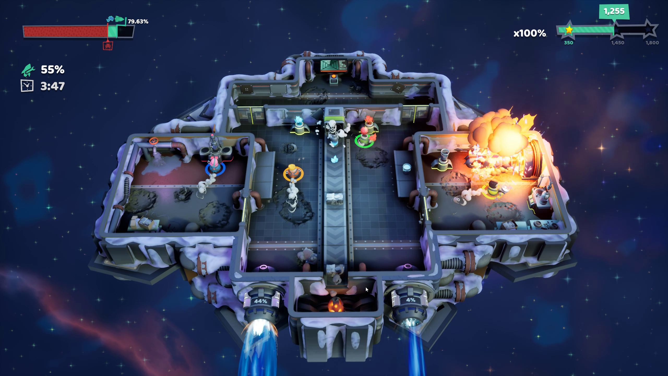 You’ll also have to manage asteroids, which will explode into fireballs or green goop that slows down anyone walking through them if not disposed of quickly. Sometimes you’ll be separated from your teammates, and you’ll need to throw switches to open doors for one another or pass items along conveyor belts.