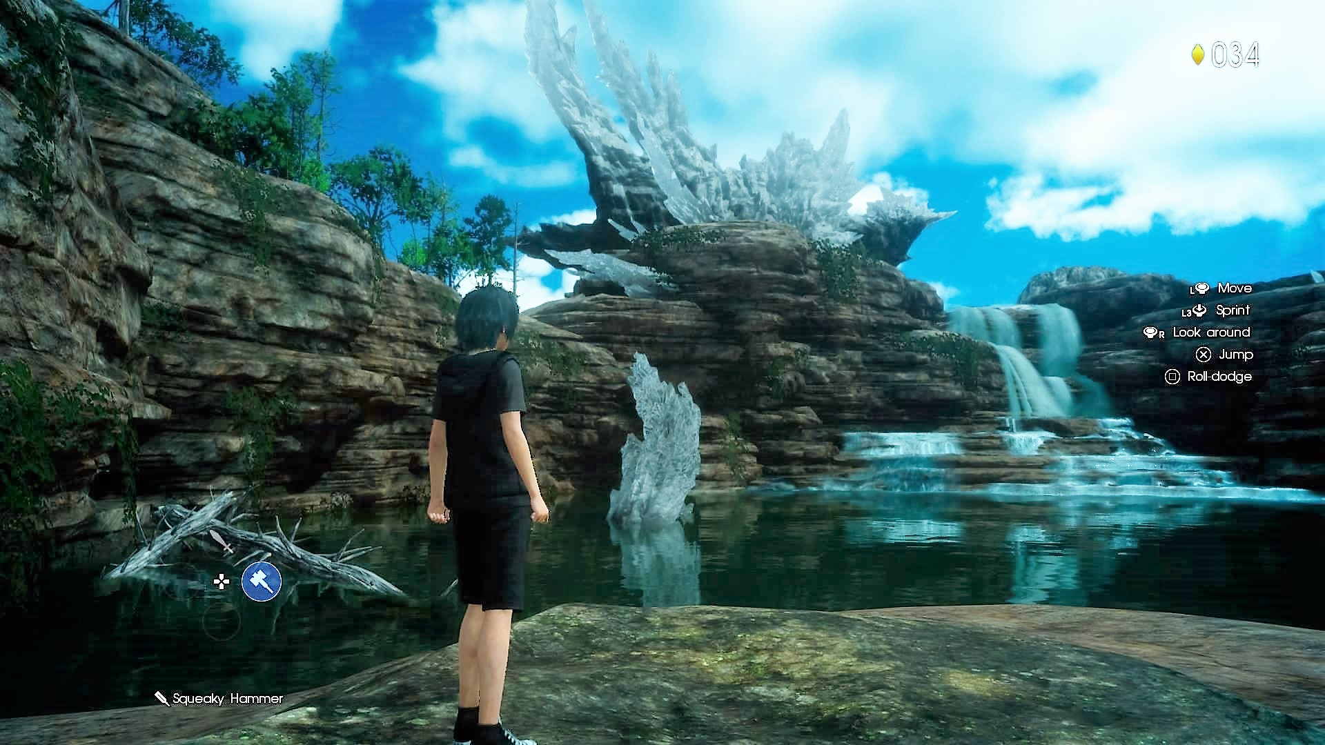 Though not explicitly stated, the demo itself was more of a way to showcase the game’s aesthetics and new, action-oriented combat system. It has the player entering the dreams of young Noctis, the story’s protagonist. In this dream state, you travel through four different “dreams” or environments, each exhibiting something unique in its own regard. In the first, you find yourself in a wooded area, navigating over branches and boulders, surrounded by beautiful greenery and pools of water. Here Square Enix gets a chance to show off the lush wilds they have put so much time and effort into. The water physics and lighting have improved greatly, reacting fluidly to weather effects and camera angle. By steering Noctis onto interactive buttons or plates on the ground, we also get a chance to see the changing of night and day, as well as different weather options. While the first dream is relatively short, the attention to detail in the creation of the environment is truly astounding.