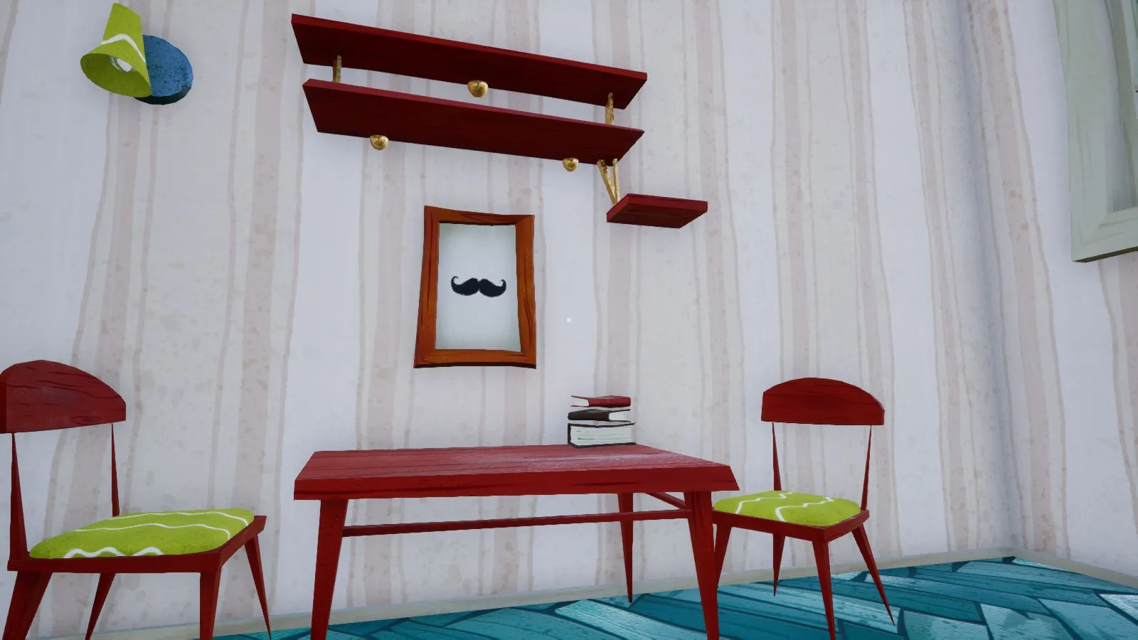 A table missing its family, centered around a painting of a mustache with shelves for platforming… that’s Hello Neighbor in a nutshell!