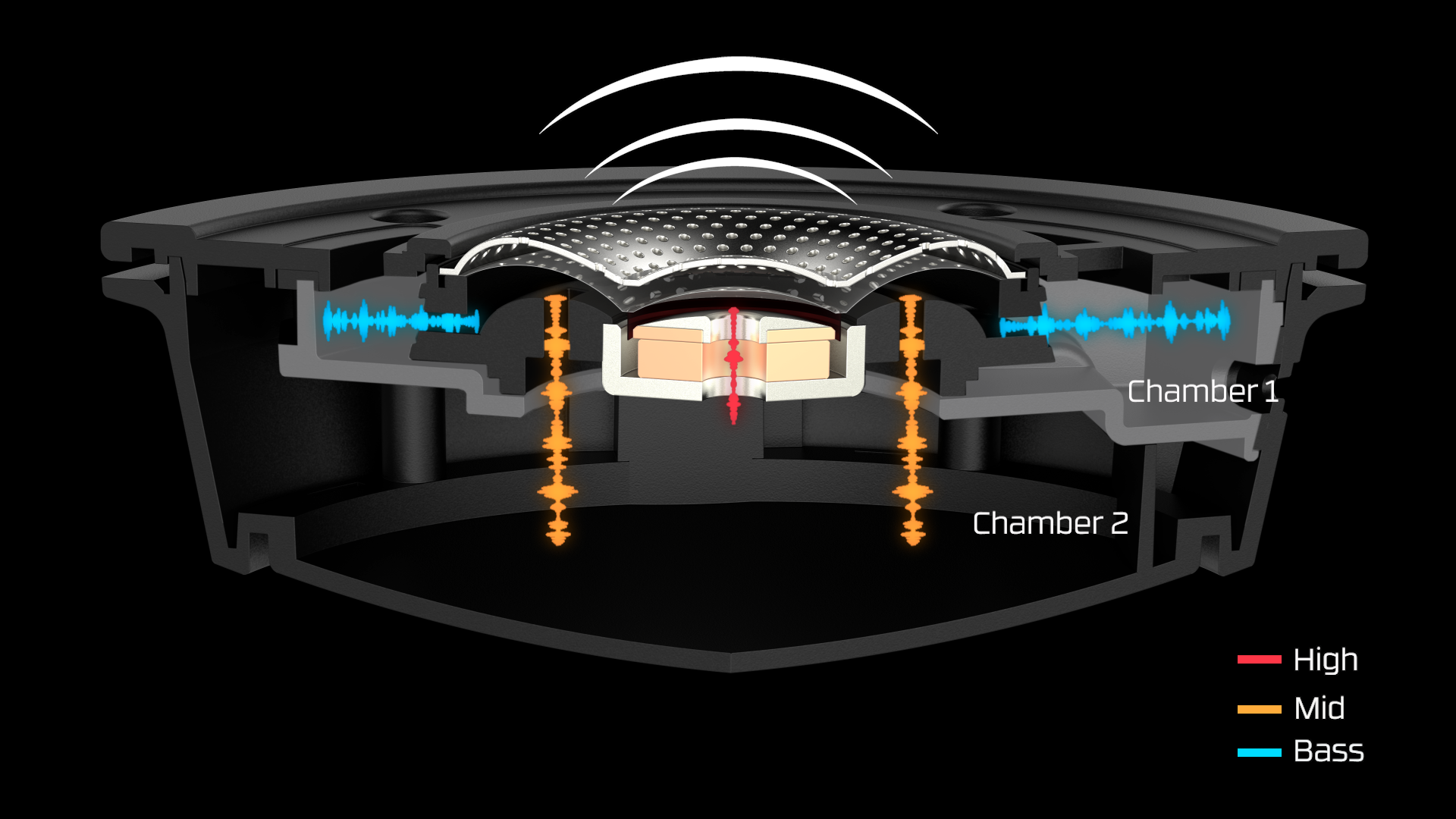 What really distinguishes the Cloud Alpha from the Cloud II is the proprietary dual chamber drivers that HyperX designed and implemented to help reduce distortion and distinguish bass tones from mids and highs so that audio is cleaner and crisper. Here’s a look at the new design and how it separates these sounds so they reverberate more clearly: