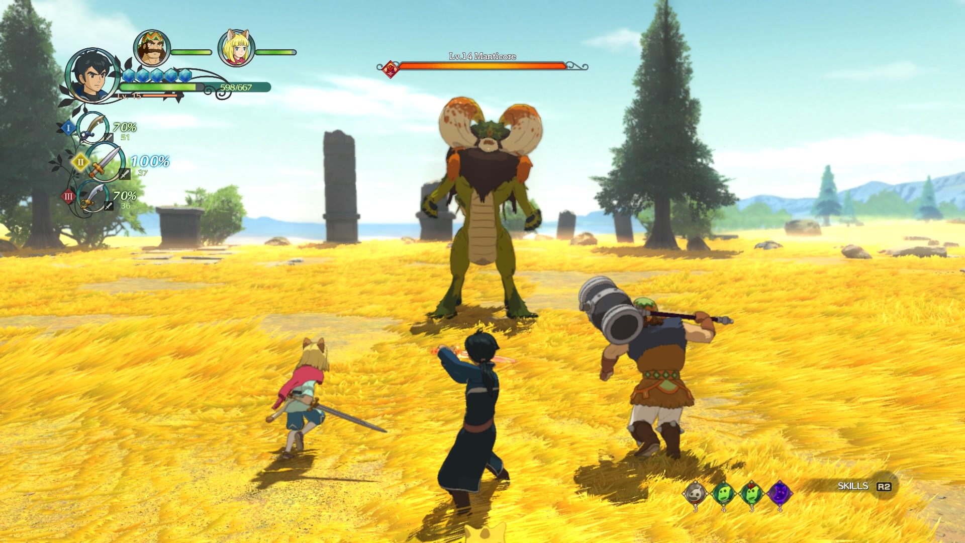 Players have free reign of the battlefield and can attack, guard, and dodge however they wish. The aforementioned higgledies are more than just comedic effect: They act as powerful allies in battle, whose skills can make or break a fight. Their skills buff and attack, and choosing the right team of higgles is an important part of combat preparation.