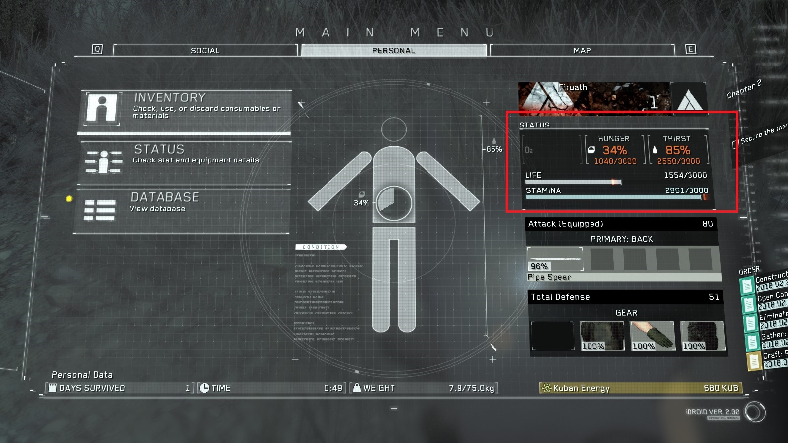 Hunger and thirst meters even drop while you are in your iDroid menu or crafting objects, so you can literally be on death’s door just by spending a few minutes crafting fences or making new weapons.