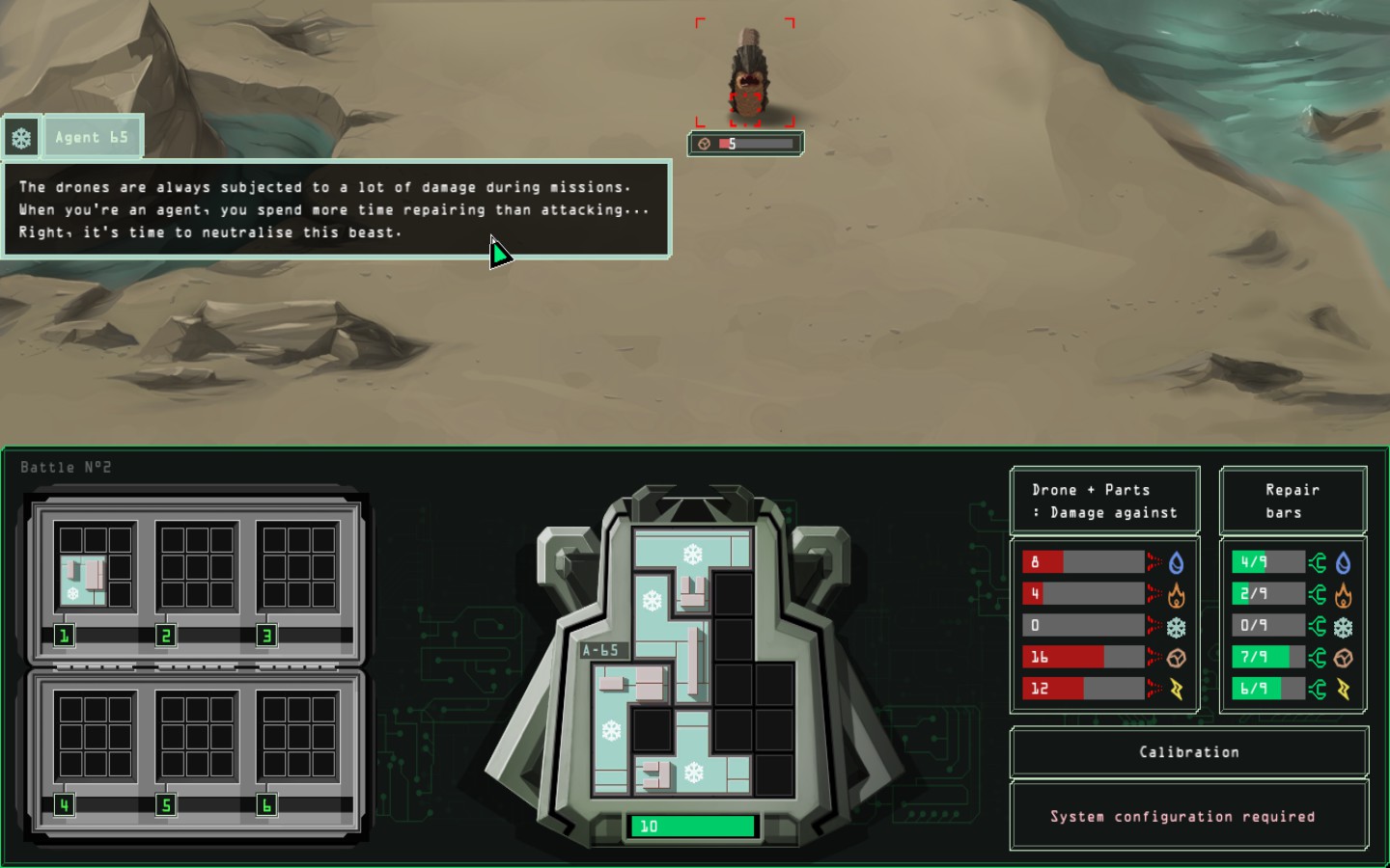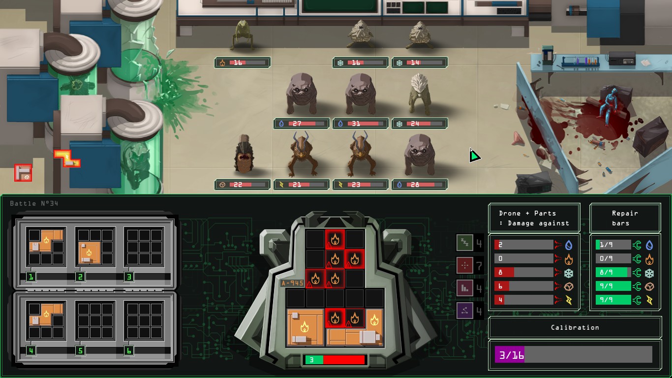 Once an enemy counterattacks, it leaves behind a square of its element in your drone’s grid, which causes you to actively plan around that obstacle. The only way to actually fix your drone is to sacrifice your attack tetrominoes. Sadly, the game doesn’t give you a reliable way to earn more attack or repair pieces throughout the game, so you are often left scraping by between battles.