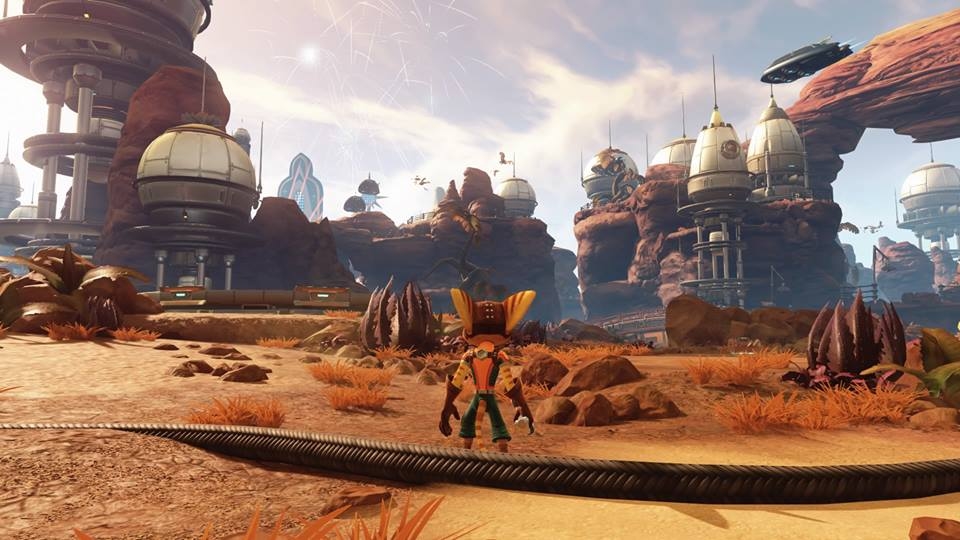 The very first thing anyone can’t help but notice about Ratchet & Clank is how gorgeous it is, quickly followed up by how lively everything seems. As soon as you exit the garage in the tutorial, you’re met with the cartoony-yet-detailed desert landscape of planet Veldin and a sky bustling with hovercrafts going to and fro. It’s almost impossible not to take a screenshot right then and there.