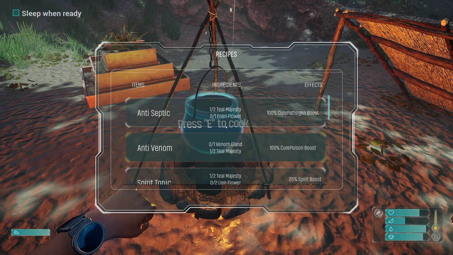 Cooking gives you access to a wide variety of dishes, though there’s no way to cook single items like meat on the campfire, a strange deviation from the typical survival formula. Frustratingly, none of the meals can be added to your inventory after they’ve been made either. It’s an odd choice to rely on fruits, vegetables, and smoked meats while away from your campfire cooking pot when you can brew and subsequently carry antiseptic and anti-venom with you anywhere, healing parasite infections or snake bites while exploring.