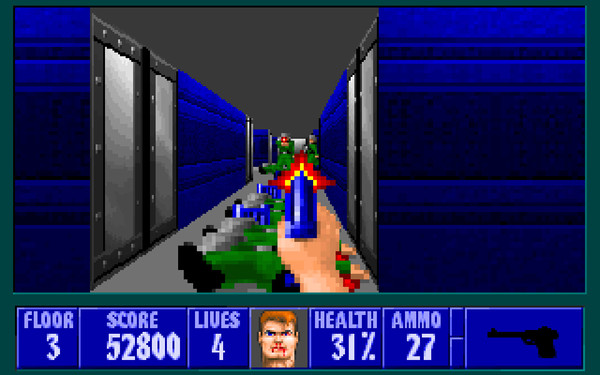 The arcade elements of a score system and lives remained and work just like they did in Wolfenstein. The lives are made redundant due to the ability to save your game at any given time. The scoring system, however, still gives the game a bit more depth for those looking to achieve the highest score possible.