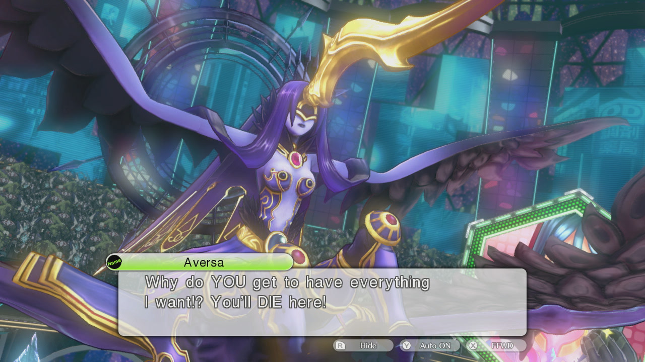 The above image more or less sums up the entirety of the “human” side of the story, as most of the plot points in the human world tie themselves to Tsubasa’s gradual rise to stardom. Along the way we meet a cast of colorful characters, including: the hero wannabe, Touma; the emo-pop star, Kiria; and the power obsessed Tsurugi. Each character has their own anime-style archetypes, and the story that they go through is somewhat inspired by the High School life found in Persona entries of the Shin Megami Tensei series.