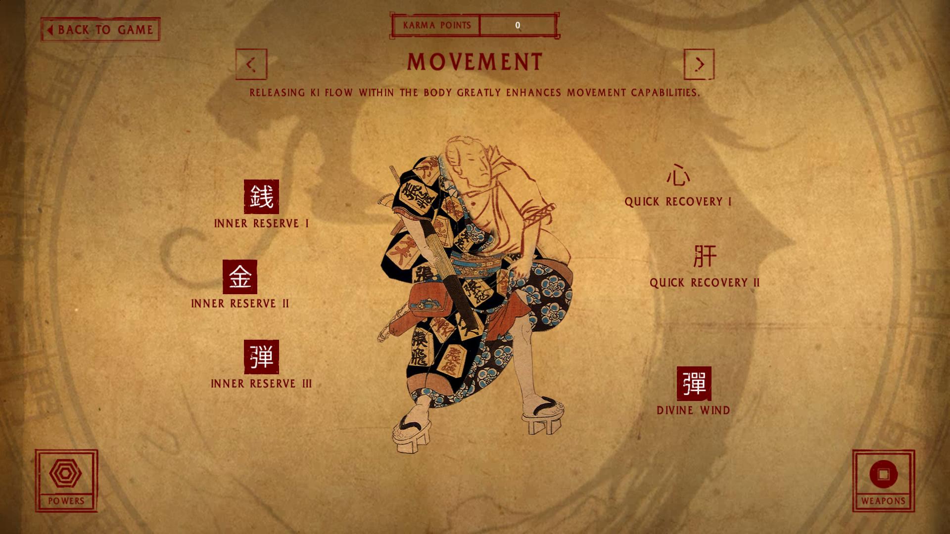 One of the games main features is the character development. As you progress through the game, you will gain Karma points, Ki Crystals, and money — all of which can be used to upgrade your character and weapons.