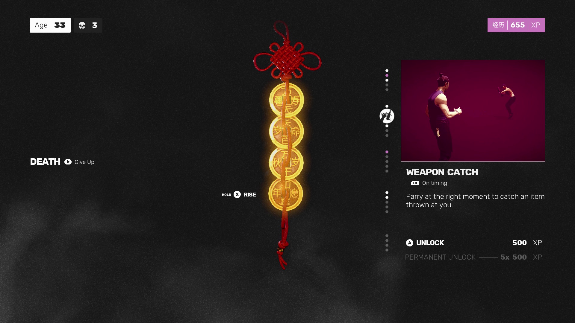 It’s an interesting push-pull, but it doesn’t work very well. Getting hit in Sifu does so much damage by default that there’s no particular benefit to playing as a young character, except that it gives you a slightly better cushion for mistakes.