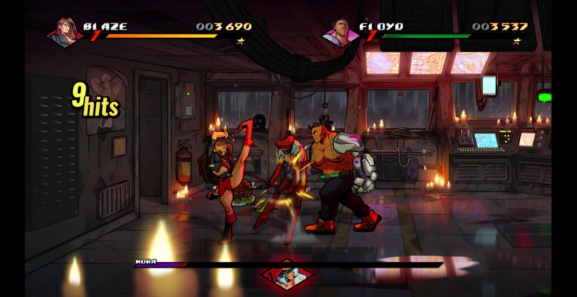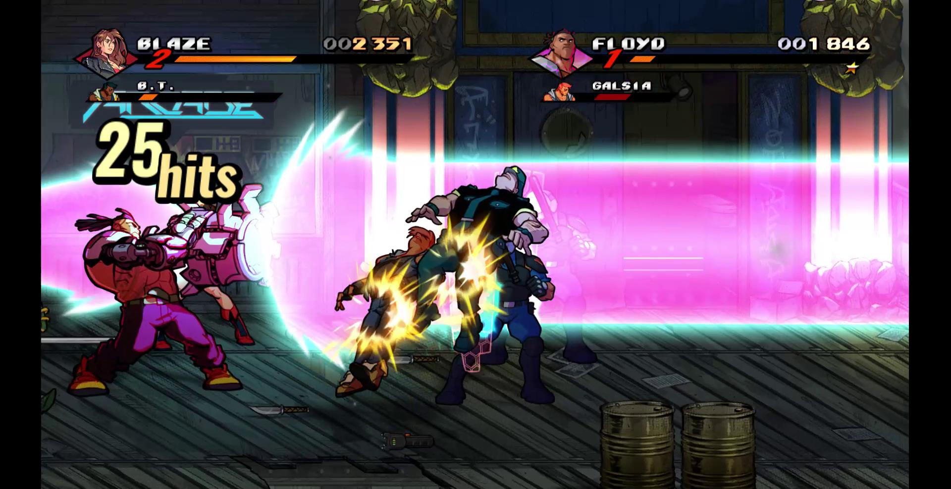 Axel and Blaze set out to track the Y twins down. They’re joined by Floyd, a cybernetically-enhanced brawler who is blatantly Jax Briggs from Mortal Kombat (although Jax never had the Proton Cannon, so that’s something); Cherry, a guitar-wielding musician who’s the daughter of Adam Hunter from the original Streets of Rage; and Adam, who rejoins the playable roster after you clear a few chapters in Story Mode.