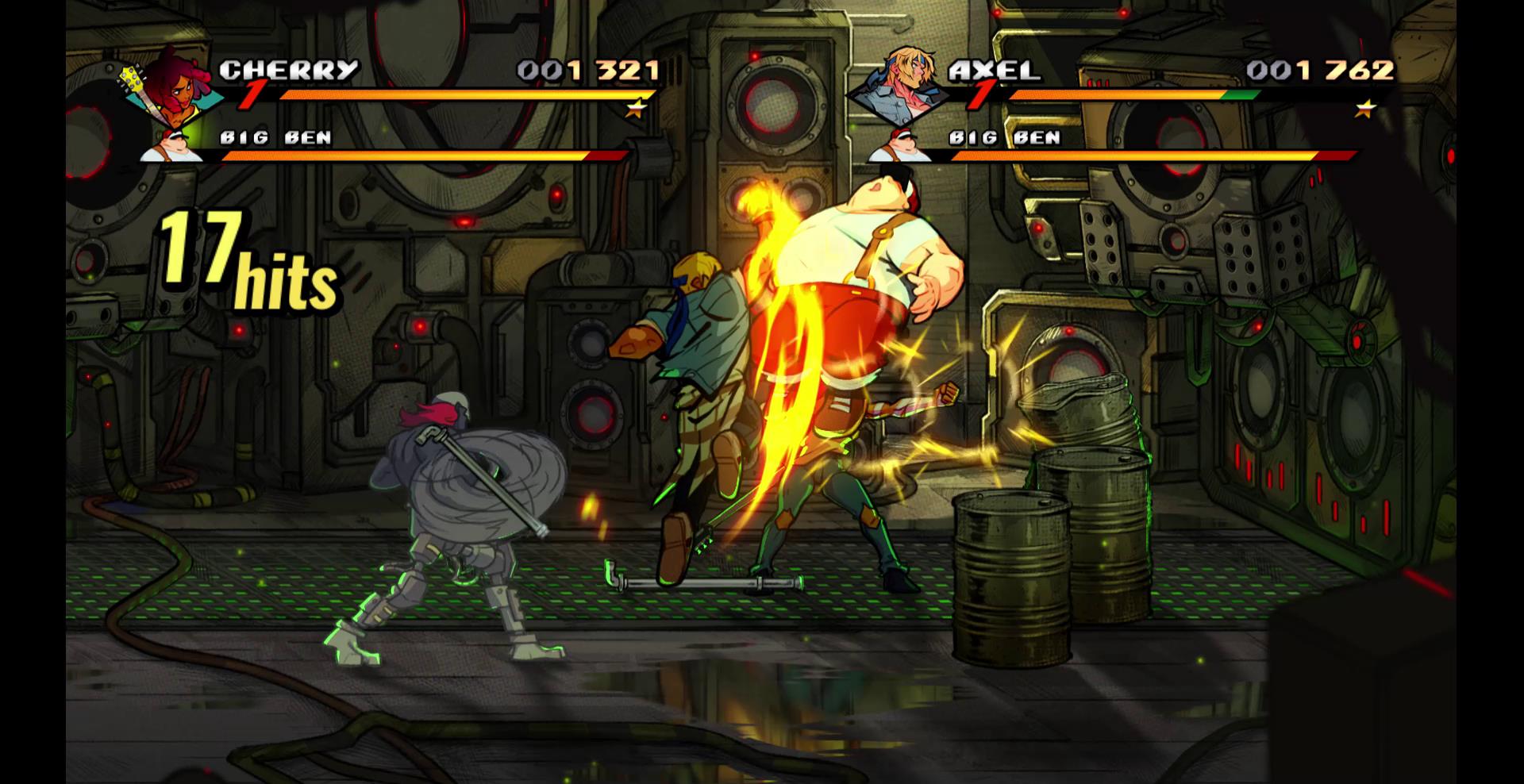 Blaze does a double palm strike that knocks enemies flying, Floyd grabs an enemy from a fair distance away, Cherry slams an enemy with her guitar, and Axel… well, Axel grew up and went the rest of the way towards being a scruffy-bearded Ken Masters, so he Dragon Punches guys.