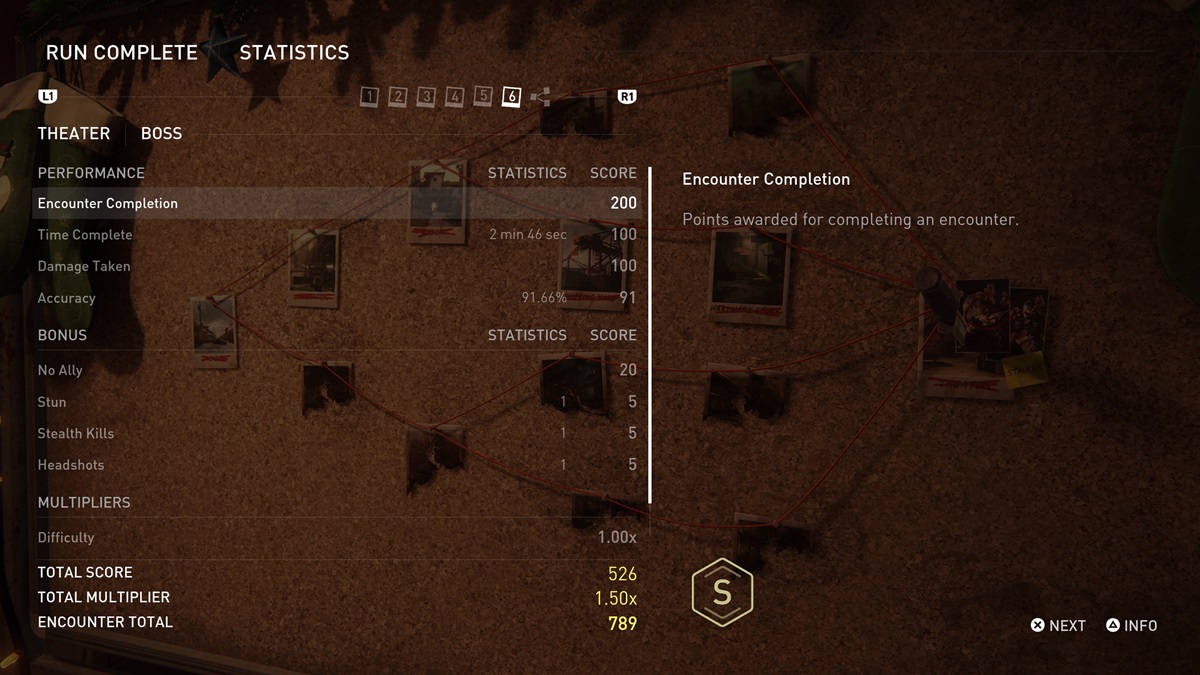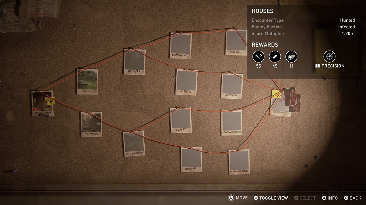 Runs consist of 14 encounters made of randomly selected levels from the TLoU2 campaign; level layouts are not randomized, so while you may think you’ll eventually memorize optimal pathing, where to camp, and where to stealth kill enemies, spawns and pathing keep things fresh. Of those 14 available encounters, only six are required to complete a run across six possible branching paths. All paths end in a boss battle against six possible bosses, ranging from Bloaters, a Rattler Captain, and the Rat King.