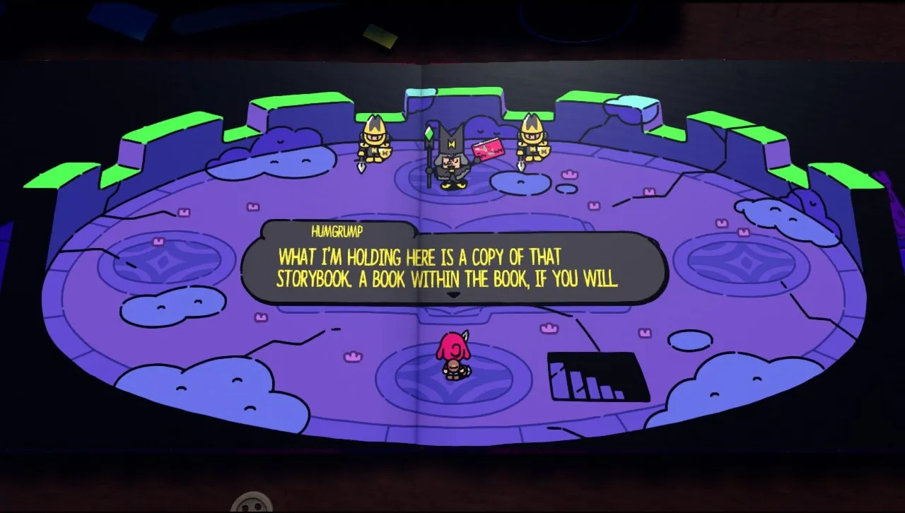 The Plucky Squire begins with Jot running an errand for the local music-mixing wizard, Moonbeard. He explores the land of Mojo a bit – even gets in a fistfight with a honey badger – before the story takes a different turn. The villainous sorcerer Humgrump has discovered a way to rewrite the tome, and magically forces Jot outside the picture book and into the 3D world.