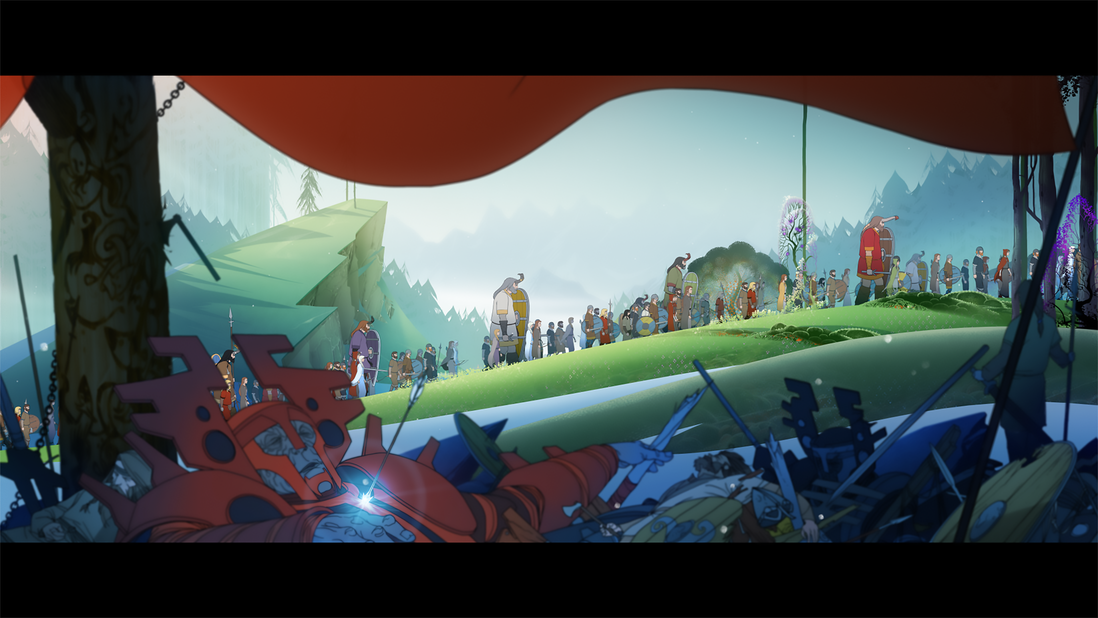 The Banner Saga 2 stands on four main pillars: choice-driven storytelling, breathtaking art design, tactical turn-based combat, and heartstopping audio. The foremost of these pillars of tradition that uphold The Banner Saga 2 is the art and animation. Somewhere between Don Bluth and classic Disney, every single part of the whole is exemplary. The environments and backgrounds, particularly the brilliant use of foregrounds, give immense scale to your undertaking. Each character you meet feels unique to this world alone despite the clear Norse influences. Having such wide panoramas creates a scale for this game which feels monolithic and makes you and your characters feel rather small in the face of such a staggeringly beautiful tale.