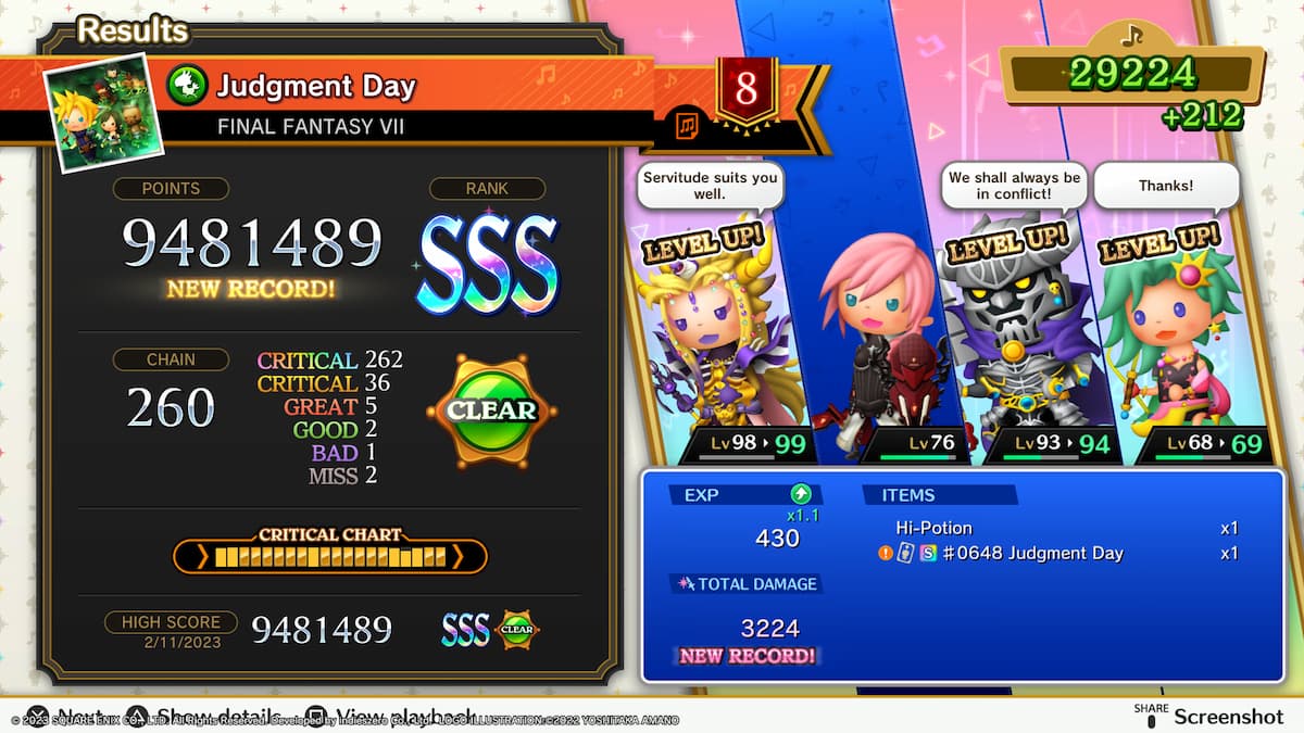 Self-improvement is a huge part of any rhythm game. However, not everyone is intrinsically motivated to chase a higher score. After all, everything can be unlocked on the basic difficulty here. That’s why scoring systems are so integral to a proper feedback loop. Thankfully, Theatrhythm’s extensive grading system clearly communicates your progress with ranks ranging from F to SSS.