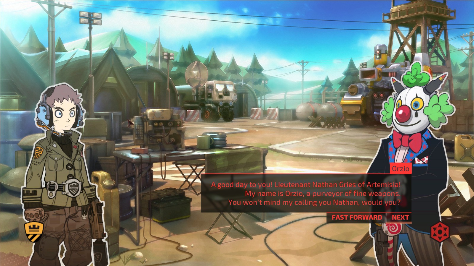 Outside of combat, during the story cutscenes you will meet some colorful and bizarre characters, like a crazy clown arms dealer. There’s almost a Persona-style tone to the characters and interactions as you move along, with the main characters feeling like teenagers who are in positions of power for some reason while really evil people are showing up in their lives.