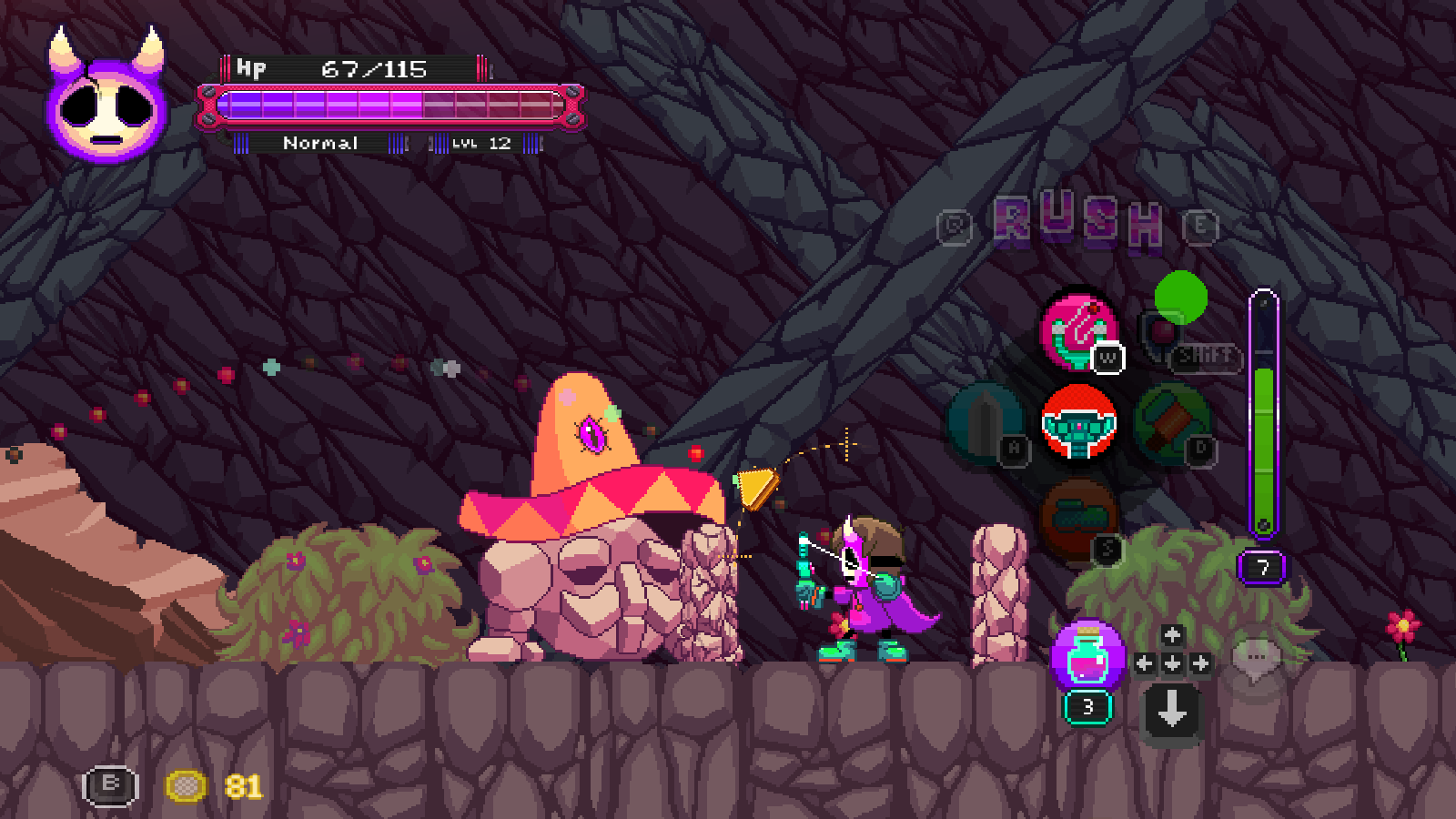 I expected to be faced with either turn-based battles or regular ol’ hack and slash when going about my journey and was met with something entirely different. People that are familiar with Undertale might see some similarities in Underhero’s battle system. Once you come across a monster you initiate a fight where you can talk to your opponent to get the occasional hint or even bribe them with your own hard earned cash so that they’ll leave you alone.