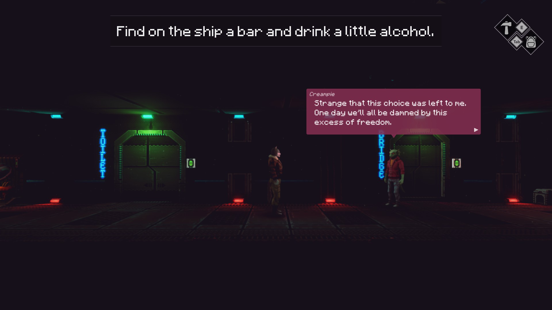 The worst one by far is an android that asks you which head to use. I picked the anthropomorphic option, as I did with the rest of the characters, and the response was, “Strange that this choice was left to me. One day we’ll all be damned by this excess of freedom.”