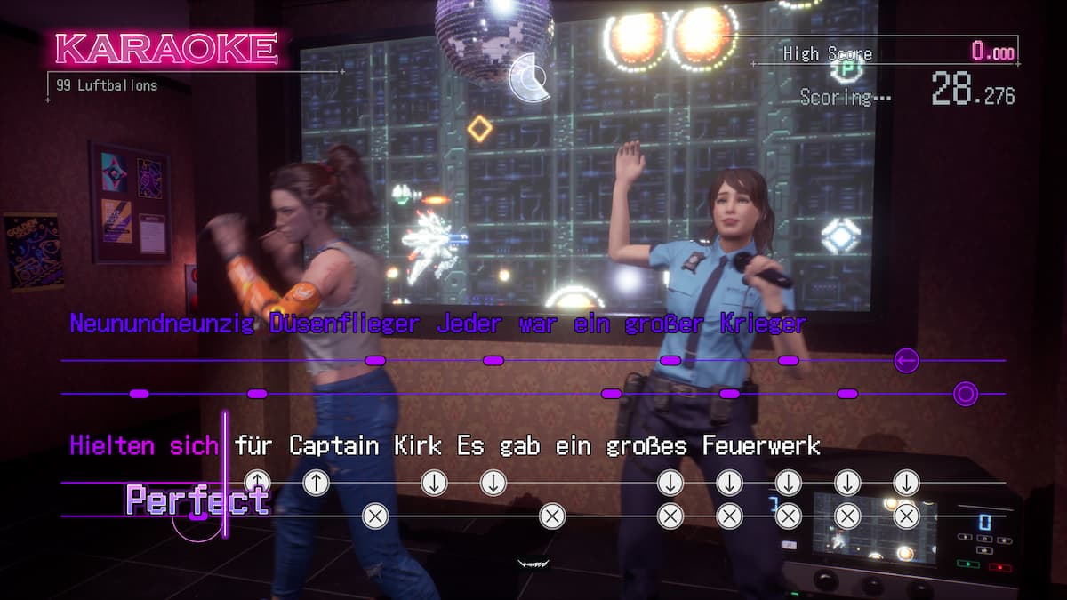 After their initial introduction, you can engage with any of the distractions within Wanted: Dead’s police headquarters, which acts as a hangout spot between story missions. Activities include a claw game, karaoke, a pixel art side-scrolling shooter, and a rhythm minigame where you scarf down ramen. There’s even a jukebox that includes a selection of 80’s pop and rap, with the music unabashedly ringing throughout the entire station.