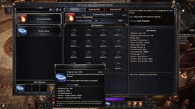 The active skills modifier menu in Wolcen: Lords of Mayhem.