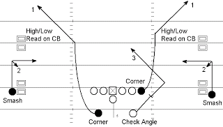 Where the over-the-middle routes we've talked about are timed so that the read happens as the receiver passes across the QB, the read here is a little earlier. As you might expect, the key moment happens when the slot and outside receivers cross.