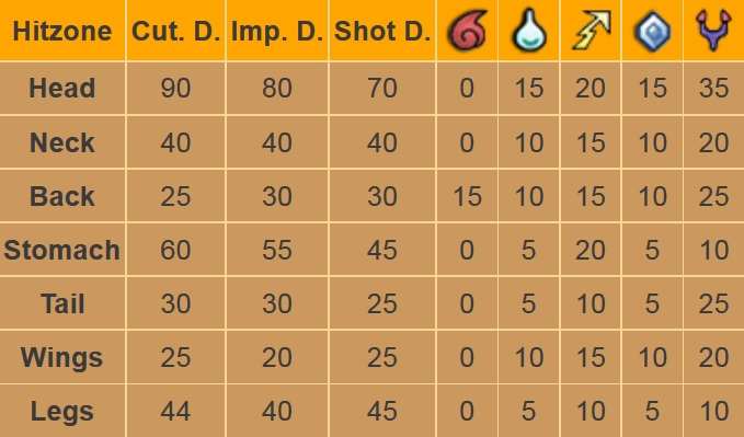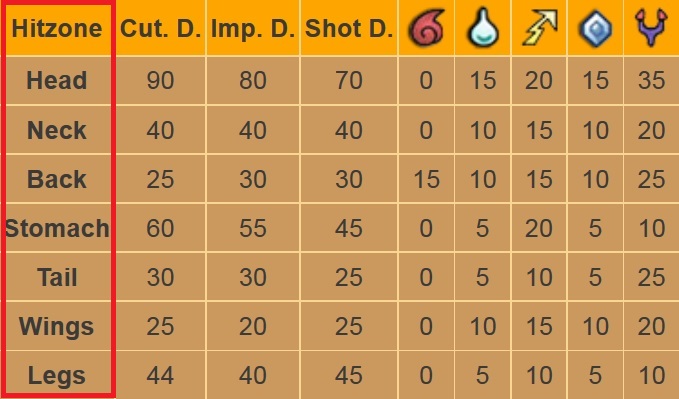 First the columns, now the rows. The rows of the table are divided by the hitzone on the monster. Hitzones can range from general regions like a monster’s back to more specific areas like a back-fin, so wording can get confusing (e.g. “does ‘claw’ mean the wing claws or the feet claws?”), so be sure to know which part the row’s referring to in the table.