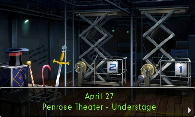 - Examine Stage Lifts #1 and #2, the sword and stand, the red tape in an X on the ground, the hat, the two ladders, and the writing on the wall.