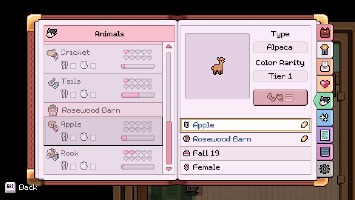Like horses, alpacas cost 2,300 Tesserae each at Hayden’s shop following his coop and barn upgrades. They produce alpaca wool regularly, regardless of gender. Three standard color variants are available, including Black, Brown, and White.