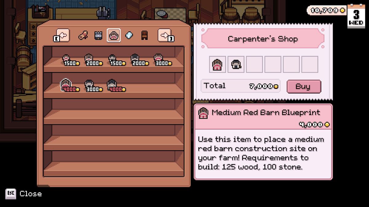 | Medium Coop | 3,000 T | x100 Wood x75 Stone | Upgrade Hayden’s coop and barn to purchase at Carpenter’s shop |