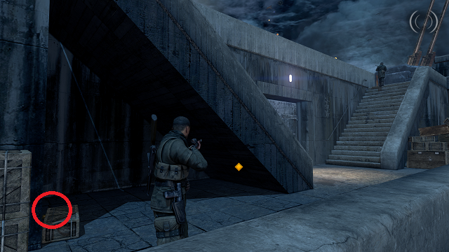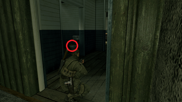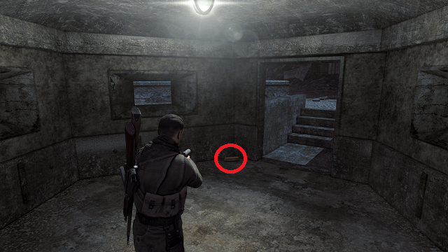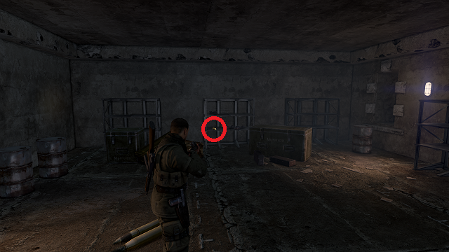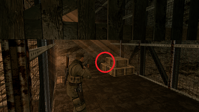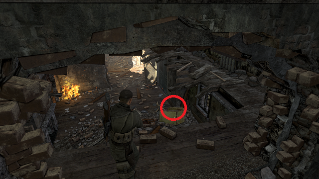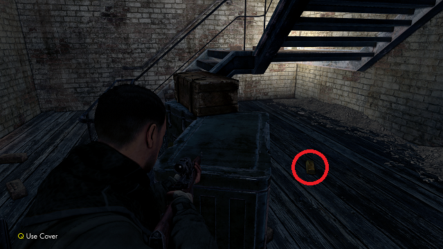 Now, go into the building and past the ammo cache. Take an immediate left and go downstairs. Follow the small path around to the right to find the next gold bar hiding behind an upstanding crate.