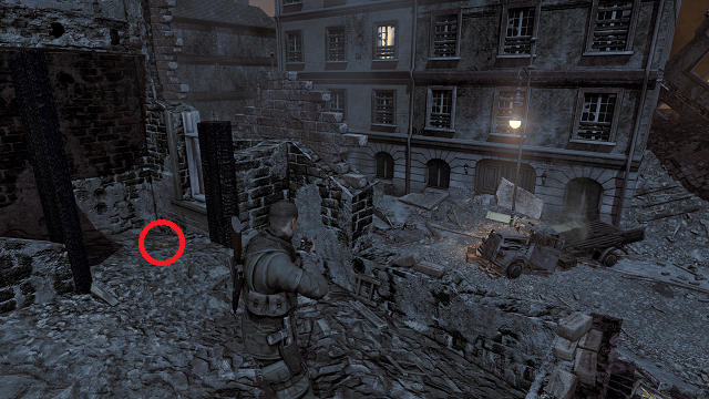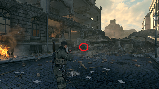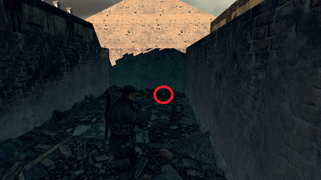 Now go along the backside of the courtyard, all the way across to the right side. When you reach the rubble blocking your path, you’ll see a bombed out car next to a building on the left. The gold bar is in the back seat of the car.